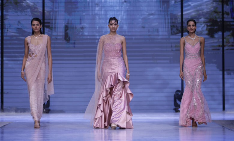 Sonaakshi Raaj’s collection, aptly named “The First Kiss,” mesmerized attendees by translating the emotional intensity and romance of intimate moments into fabric, color, and movement. Featuring 20 to 30 exquisitely detailed ensembles crafted from luxurious materials such as delicate tulle, silk, and organza, the collection balanced intricate floral embellishments and a gentle sheen with bold, sculptural shapes. Its palette gracefully transitioned from soft blush, ivory, and gold to deeper, passionate shades of crimson and midnight.